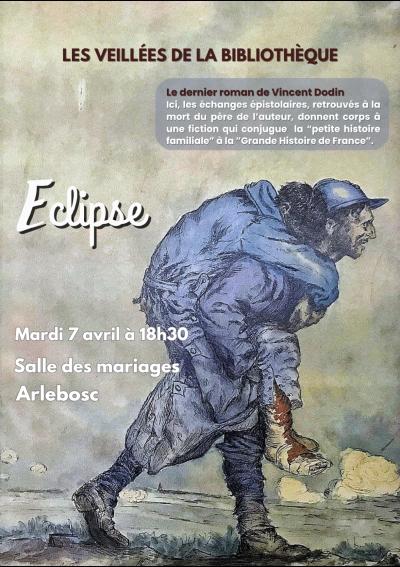 Mardi 7 avril, les Veillées de la bibliothèque accueilleront Vincent Dodin. Il présentera son dernier roman : "Éclipse": l' histoire de 2 frères, une histoire de famille prise dans la tourmente de la guerre de 14-18, une histoire née de lettres cachées et retrouvées. L'auteur, Vincent Dodin , psychiatre qui fut professeur de la faculté de médecine et de maïeutique de Lille, est installé depuis 3 ans à la Colonie des Demoiselles à Sarzier. Avec ce roman, il nous fait pénétrer dans l' intimité d' une famille en même temps que dans l' histoire de France. Nous aurons le plaisir de l' entendre mardi 7 avril à 18h30, salle des mariages, mairie d' Arlebosc. Comme à l' accoutumée , cette rencontre se terminera avec " tisanes" variées et petites madeleines. Rendez-vous mardi 7 avril !