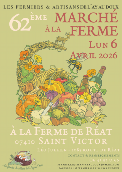 L'Association des Fermiers et Artisans de l'Ay au Doux vous convie à son 62ème Marché à la Ferme ce Lundi de Pâques chez Léo Jullien, à la Ferme de Réat, une jolie ferme laitière à Saint Victor !
