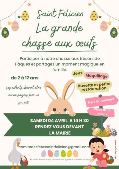 Rendez vous devant la mairie de Saint Félicien pour un départ de la chasse dans le parc du couvent. Tous les enfants de 2 à 12 ans peuvent participer mais ils doivent être accompagnés obligatoirement par un parent.